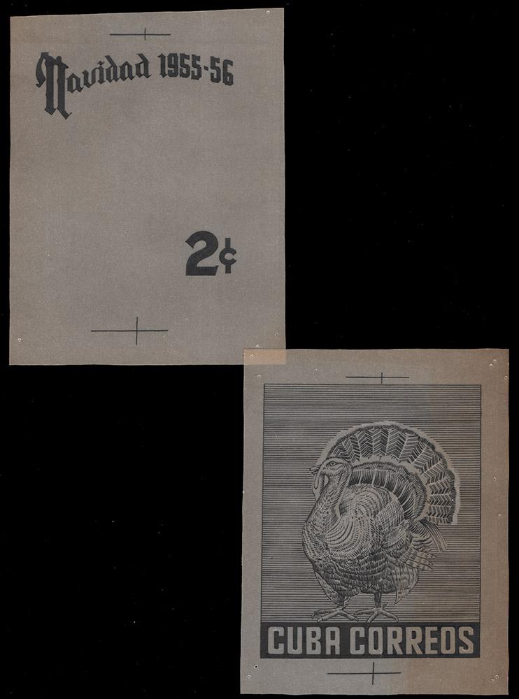 CUBA 1955-56 PRE-PRODUCTION INK RENDERINGS ON TRANSPARENT PAPER, #547, C142, essays in ink of the 1955 2c Turkey Christmas stamp and the 1956 30c Quail Air Post stamp, rare proof material (Image)
