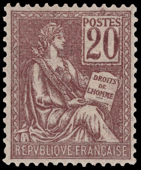 FRANCE 1900, 20c BROWN VIOLET MINT, #118, well-centered, very lightly hinged, extremely fine, cat. $55.00, Maury #113 @ €75.00 (Image)