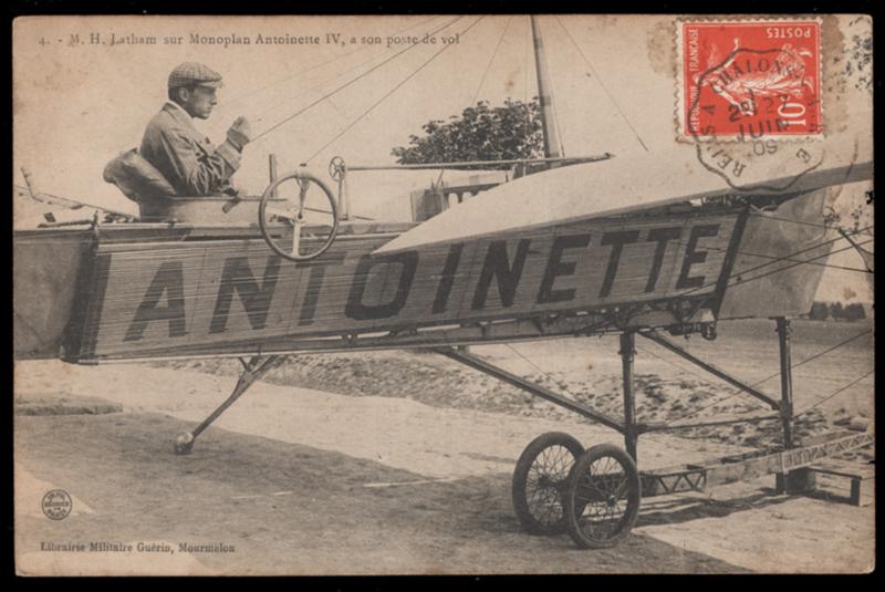 M.H. LATHAM - FAMOUS FRENCH PIONEER AVIATOR POSTCARD SHOWING HIM SITTING IN THE ANTOINETTE IV, #182, 10c red tied by June, 1909 d.s. on the front of the postcard, Latham set the world altitude record of 155 meters (509 ft) in an aircraft of this type in August of 1909, fine-very fine (Image)