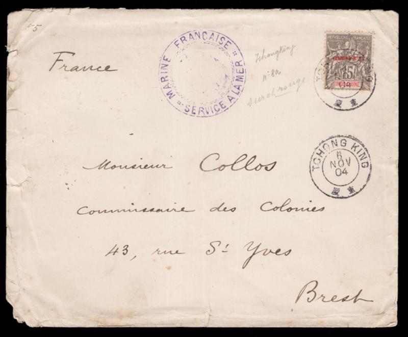 FRANCE, OFFICES IN CHINA - TCHONGKING, 1902, 15c GRAY FIRST ISSUE OVERPRINT IN RED ON COVER TO FRANCE, unlisted in Scott, tied by Tchong King d.s. on Nov., 1904 cover to France, violet "MARINE FRANCAISE SERVICE A LA MER" handstamp cachet, Han Keou Poste Francaise transit backstamp, cover edge flaws, fine-very fine, scarce usage, cat. Yvert #8a (Image)