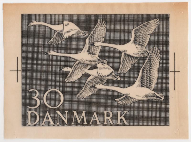 DENMARK, 1956, 30o SWANS PRE-PRODUCTION INK RENDERING ON TRANSPARENT PAPER, #361, 132x97mm, essay in ink, rare proof material (Image)