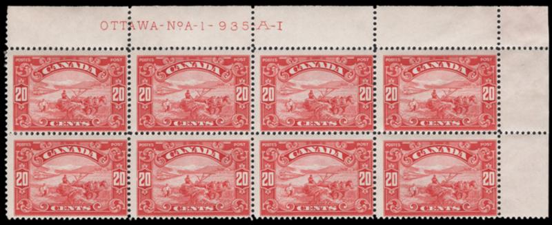 CANADA, 1929, 20c "SCROLLS" TOP PLATE BLOCK #A1 OF EIGHT MINT, #157, gum bit mount glazed, minor perf sep in top selvage, fine, cat. Unitrade C$310.00 as plate block and two singles (Image)