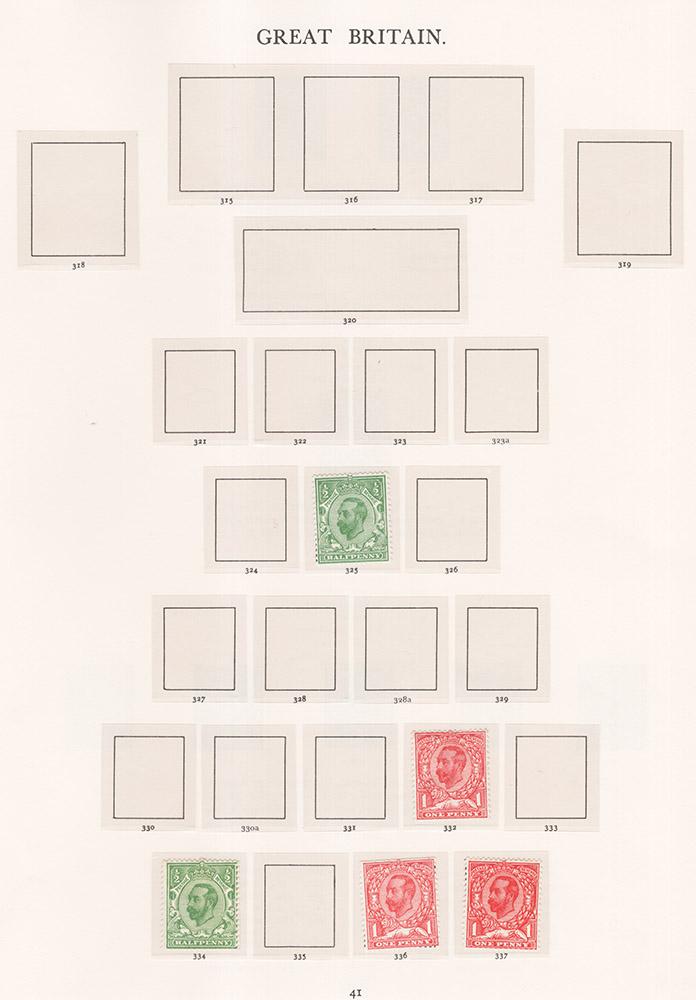 GREAT BRITAIN, 1912-24, GEORGE V MINT IDENTIFIED BY SHADE ON GIBBONS PAGES, Gibbons #351//398, 59 stamps each in its proper place and identified by Gibbons numbers, overall all o.g. and fine-very fine, cat. Gibbons £1,950.00 (Image)