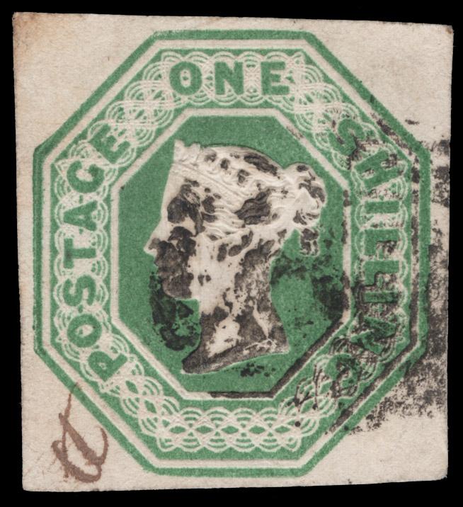 GREAT BRITAIN, 1847, 1sh PALE GREEN EMBOSSED USED, #5, large margins all around, indistinct cancel, slight diagonal crease, very fine, cat. $1,000.00 (Image)