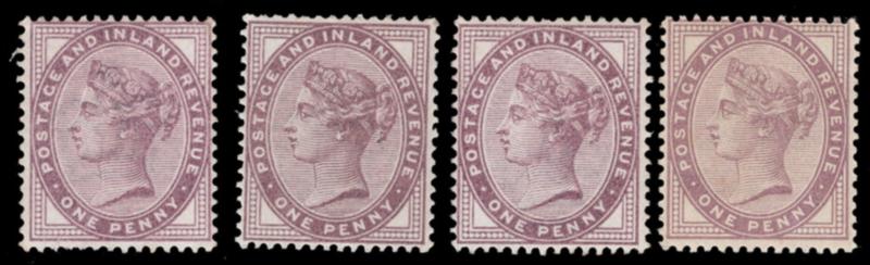 GREAT BRITAIN, 1881, 1p LILAC 16 DOTS - THE FOUR GIBBONS LISTED SHADES INCL. THE SCARCE BLUISH LILAC, Gibbons #172, 172a, 173, 174, the key value full o.g.with minor natural gum crease, the others no gum or o.g., fine-very fine, cat. Gibbons £483.25 (Image)