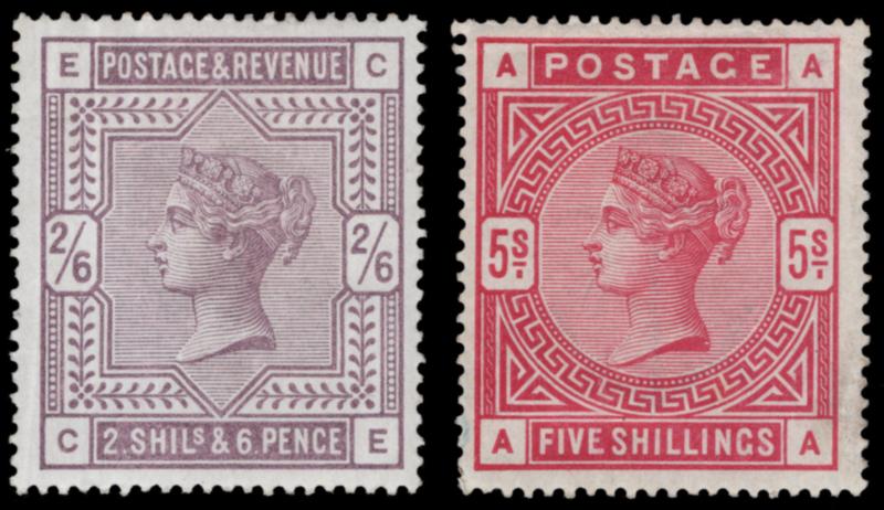 GREAT BRITAIN, 1884-84, 2sh6p LILAC, 5sh CARMINE ROSE WMK ANCHOR MINT, #96, 108, fresh in beautiful shades, o.g., previously hinged, natural gum creases mostly in the lower value, attractive pair, cat. $1,850.00 (Image)