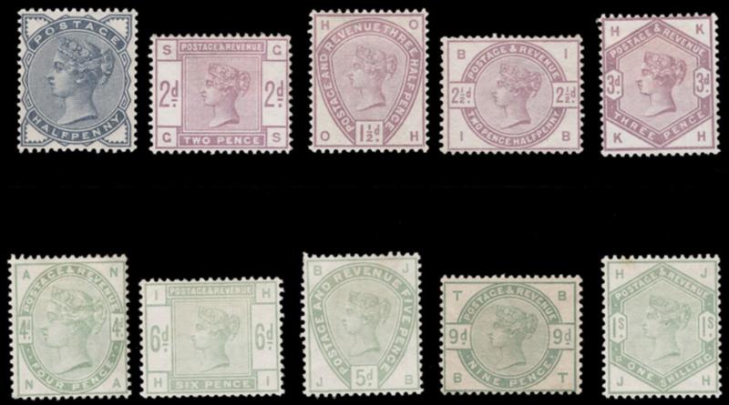 GREAT BRITAIN, 1883-84, ½p-1sh VICTORIA SET MINT/UNUSED, #98-107, overall well-centered and fresh, ½p, 1½p and 9p with original gum, previously hinged, others without gum, fine-very fine, beautiful set, cat. $6,295.00 (Image)