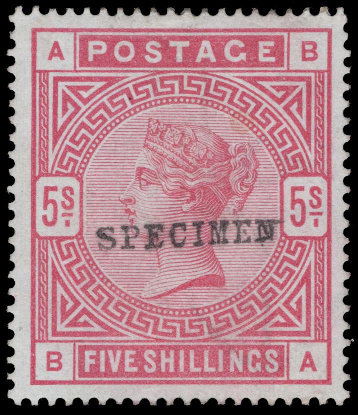 GREAT BRITAIN, 1894, 5sh CARMINE ROSE "SPECIMEN" OVERPRINT BENDON TYPE GB9, #108S, Gibbons #181s, virtually perfectly centered, fresh and very fine, cat. Gibbons £450.00 (Image)