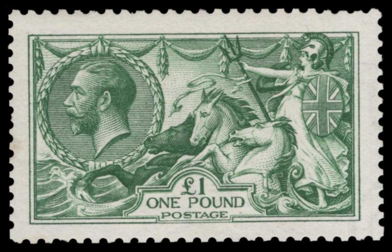 GREAT BRITAIN, 1913, £1 GREEN WATERLOW LIGHTLY HINGED, #176, well-centered, very lightly hinged, invisible toning spot, very fine, with 2025 Wenvoe cert., cat. $3,000.00, 2026 Gibbons #403 @ £3,750.00 (Image)