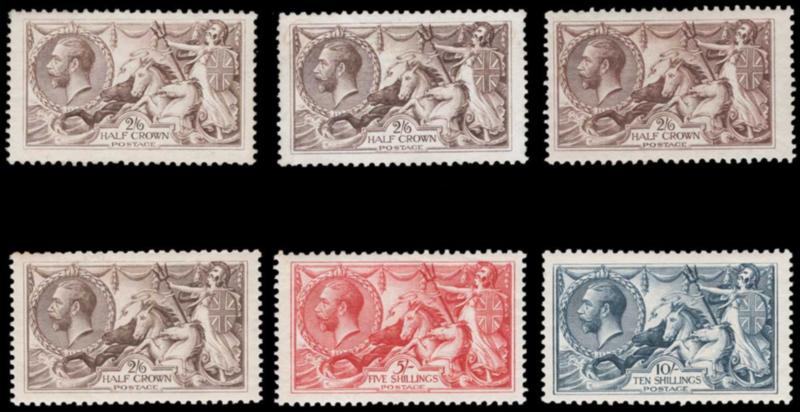 GREAT BRITAIN, 1919, 2sh6p-10sh SEA HORSES BARDBURY WILKINSON MINT, #179//181, all four shades of the 2sh6p, o.g. except 2sh6p gray brown regummed, others h.r., or lightly hinged, fine-very fine, cat. $1,510.00, 2026 Gibbons #413a//417 @ £1,305.00 (Image)