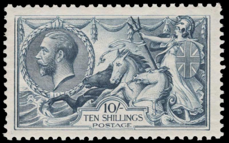 GREAT BRITAIN, 1919, 10sh BLACKISH BLUE BRADBURY, WILKINSON MINT NEVER HINGED, #181 var., well-centered, never hinged, very fine, with 2025 Wenvoe cert., scarce shade, cat. Gibbons Specialized #N71 (3) @ £1.600.00 as never hinged (Image)