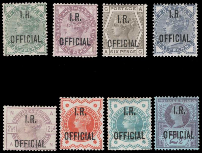 GREAT BRITAIN, 1882-1901, "I.R. OFFICIALS" MINT/UNUSED GROUP, #O2-O6, O11, O14, O16, 1p with Blue-Black overprint, mint or unused, six with 2025 Wenvoe certs, condition as described in the certs., overall fine-very fine, cat. $1,700.00, 2026 Gibbons £1,580.00 (Image)