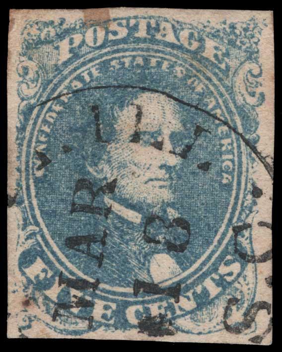 1862, 5c BLUE USED, #4, full margins, small corner crease, few toning spots on back, very fine, cat. $125.00 (Image)