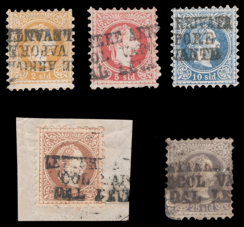 OFFICES IN LEVANT USED IN LOMABARDY VENETIA, 1864-65, 2s-25s FRANZ JOSEF WITH SHIP CANCELS "LETTERE ARRIVATE COL VAPORE DAI LEVANTE", #1, 4, 6, 7E, 7I, 10s thin, 25s corner flaw, bold cancels, rare usage, ex. Sismondo (Image)