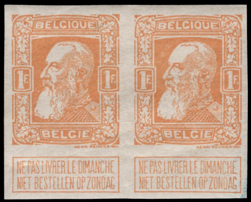 BELGIUM, 1905, 1fr YELLOW ORANGE IMPERFORATE PAIR MINT, #90 var., full o.g. appears never hinged, very fine, cat. COB79 nd @ €750.00 (Image)