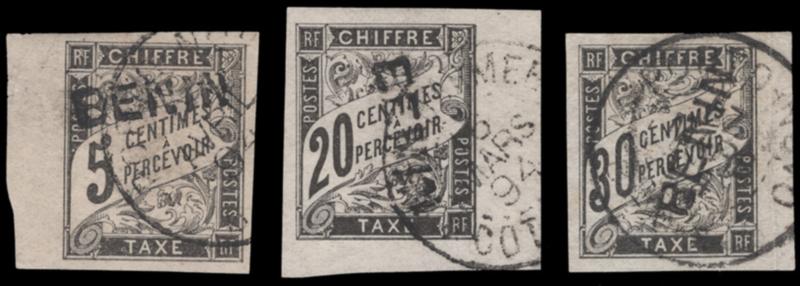BENIN, 1894, 10c-30c BLACK POSTAGE DUE USED, #J2-J4, full margins, extremely fine, signed Scheller, cat. $210.00, Yvert TT #2-4 @ €300.00 (Image)