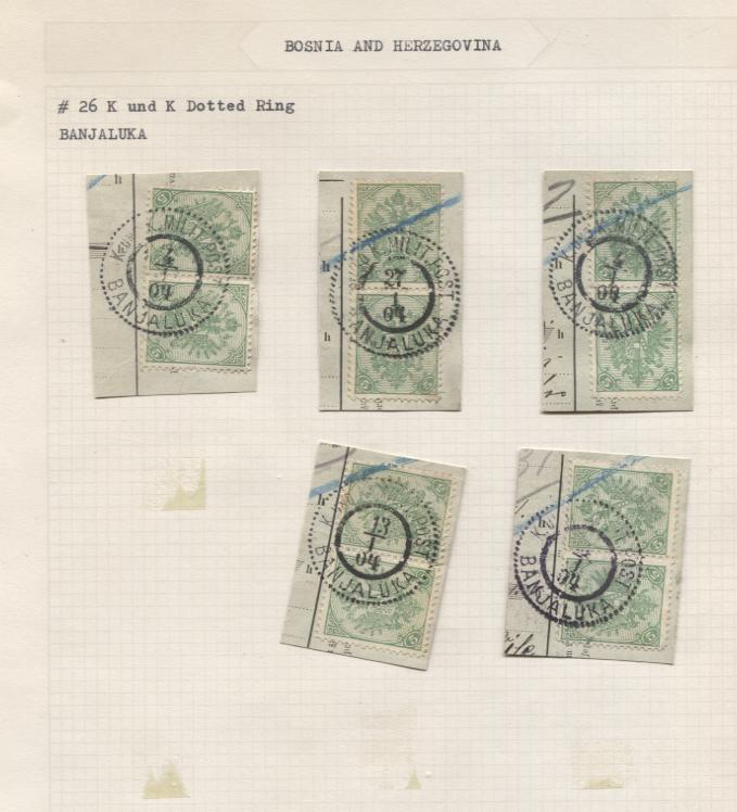 BOSNIA & HERZEGOVINA CANCELLATION STUDY IN THREE VOLUMES, approx. 1,500-2,000 stamps, all displayed on quadrille album pages, cancels on 1900 arms issue as well as later pictorial issues, many on piece allowing for full strikes to show, much apparent duplication, towns incl. Banjaluka, Bihac, Bjelina, Bijeljina, Bos. Brod, Bos. Dubica, Bosn. Krupa, Bos. Ovi., Bos. Petrovac, Bos. Samac, Brcka, Brcko, Bogojno, Cazin, Derventa, Doboj, Dobrlin, Dol. Tuzla, Devar, Drvar, Foca, Fojnica, Gorazda, Gradarac, Jajce, Kalinovik, Kljuc, Kotor-Varos, Kreka, Kupres, Lukavac, Maglaj, Modric, Nevesinje, Srebrenica, Tesanj, Teslic, Travnik, Trebinje, Usora, Uvac, Vares, Varcar Vakuf, Visegrad. Visoko, Zavidovici, Zenica, Zvornik, overall fine-very fine, we scanned 72 sample pages (Image)