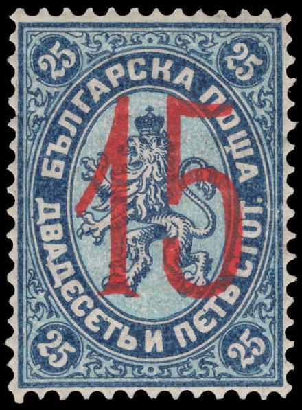 BULGARIA, 1905, 15s on 25s BLUE LITHO. SURCHARGE MINT, #21D, fresh and well-centered, lightly hinged, very fine, cat. $130.00 (Image)