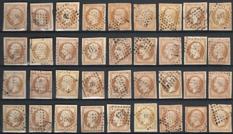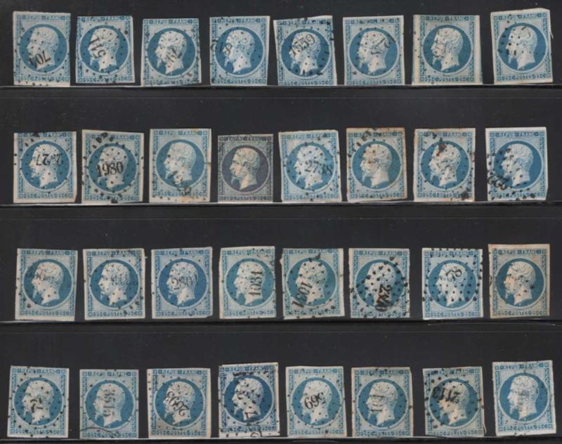 FRANCE, 1852, 25c BLUE "REPUB" NAPOLEON USED GROUP cv $3,000, #11, 93 used singles from an old Paris holding received in envelopes, mounted on stock page without further examination, great group for further study, cat. $3,000.00 (Image)