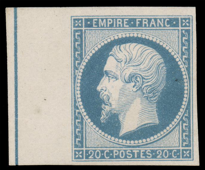 FRANCE, 1854, 20c BLUE TYPE SELVAGE SINGLE WITH LINE "FILET D'ENCADREMENT" UNUSED, #15, full margins with selvage at left, without gum, very fine, signed Brun, cat. Maury #14 I j @ €600.00, Yvert #14Ai @ €450.00 (Image)
