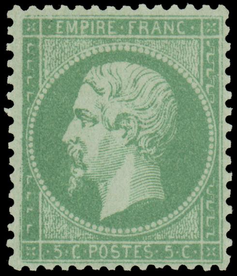 FRANCE, 1862, 5c YELLOW GREEN ON GREENISH NAPOLEON III MINT, #23, well-centered and fresh, very lightly hinged, choice very fine, signed Scheller, cat. $190.00, Maury #20 @ €300.00, Yvert #20 @ €350.00 (Image)