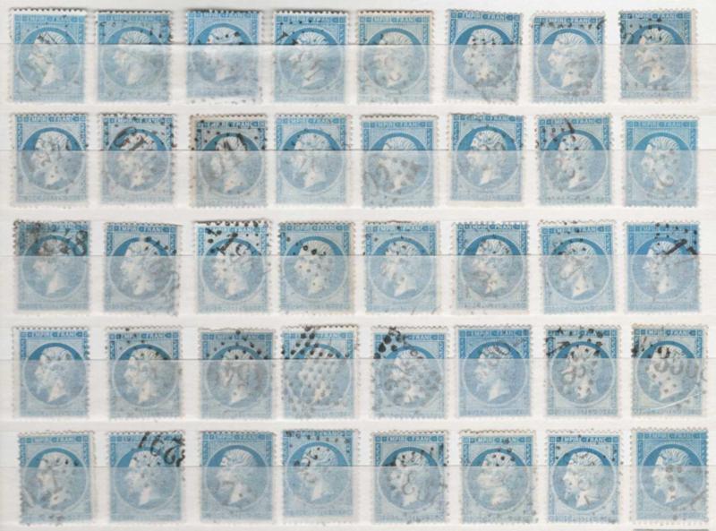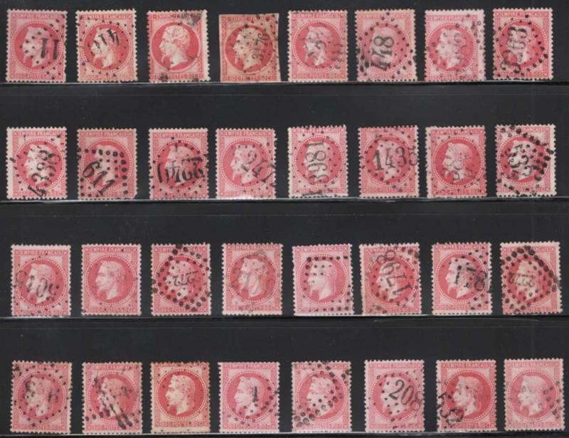 FRANCE, 1868, 80c ROSE LAUREATED NAPOLEON USED GROUP cv $2,500, #36, 125 used in singles and pairs, from an Paris holding house in envelopes, mounted on stockpage without further examination, great study group, cat. $2,500.00 (Image)