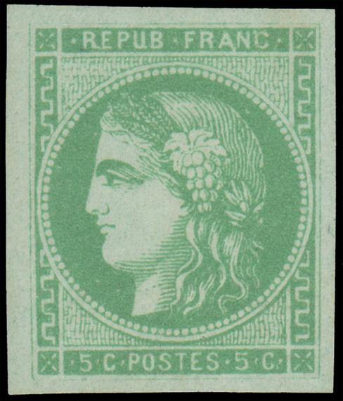 FRANCE, 1870, 5c YELLOW GREEN ON GREENISH BORDEAUX REPORT II MINT, #41, full margins, original gum partly crackled, traces of older mount, very fine, signed Brun and two others, cat. $250.00, Maury #42 II @ €350.00, Maury #42B @ €370.00 (Image)