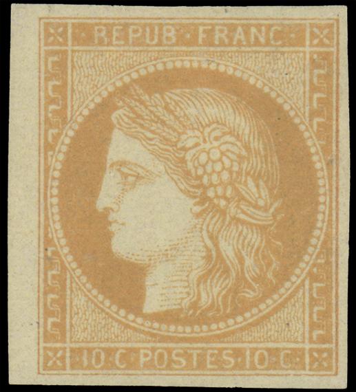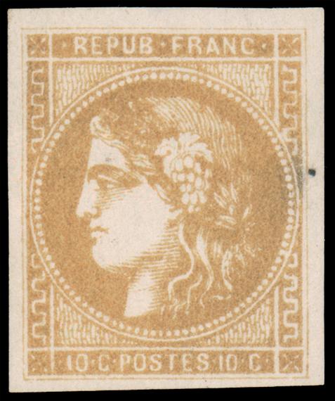 FRANCE, 1870, 10c BISTER ON YELLOWISH IMPERFORATE GRANET REPRINT, #55R, full margins, streaky, slightly toned o.g., very fine, cat. Maury #36f @ €450.00, Maury #36c @ €450.00 (Image)