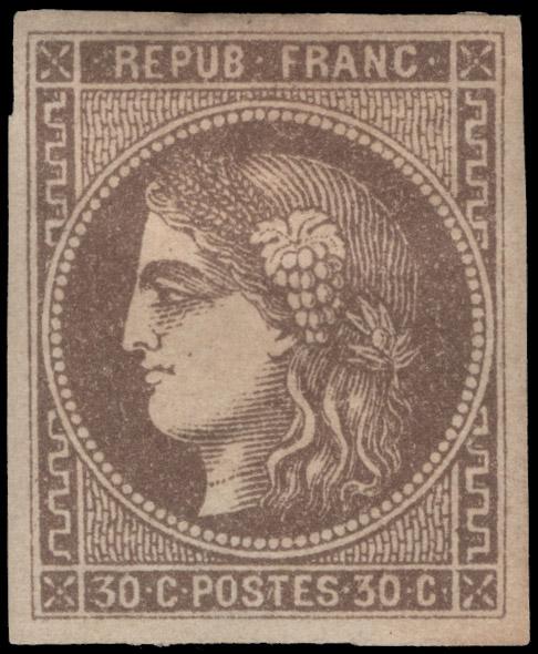 FRANCE, 1870, 30c BROWN MINT, #46, full margins, o.g., h.r., very fine - extremely fine, signed Brun & Scheller, cat. $325.00, Yvert #47 @ €500.00 (Image)