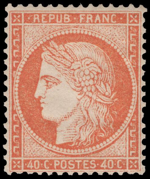 FRANCE, 1870, 40c ORANGE ON YELLOWISH MINT, #59, well-centered in a brilliant shade, very lightly hinged o.g., very fine, signed Scheller, cat. $475.00, Yvert 38 @ €800.00 (Image)