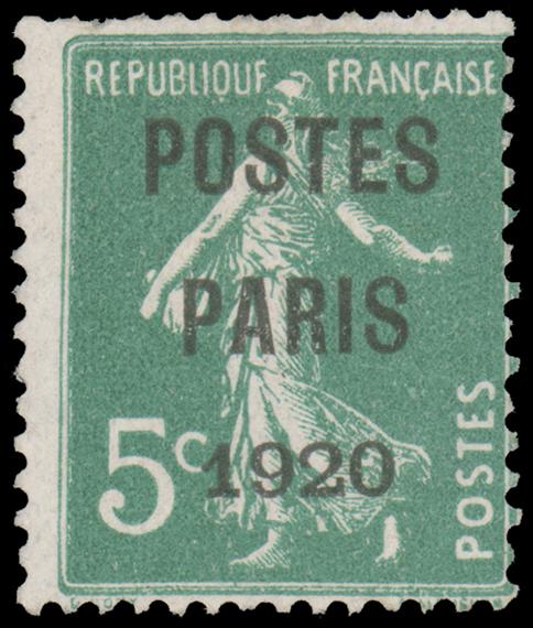 FRANCE, 1920, 5c WITH "POSTES PARIS 1920" PRE-CANCEL , without gum, fine-very fine, signed Scheller, cat. Maury #24 @ €185.00, Yvert #24 @ €170.00 both values for no gum (Image)