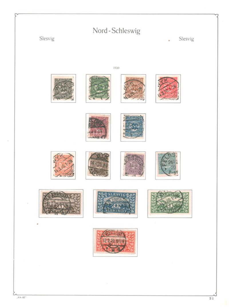 SCHLESWIG, 1920, FIRST ISSUE & "1 ZONE" OVERPRINTS USED ON ALBUM PAGES, #1-14, 15-28, all used except #26 mint, fine-very fine, cat. $227.00 (Image)