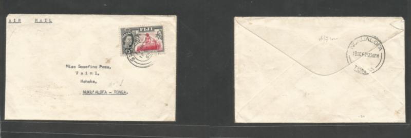 Bc - Fiji. 1962 (17 Oct) Suva - Fiji - Tonga, Nukuvalofa (19 Oct) Air single 6d QEII fkd envelope, tied cds. Arrival reverse. Extraord destination usage. (Image)
