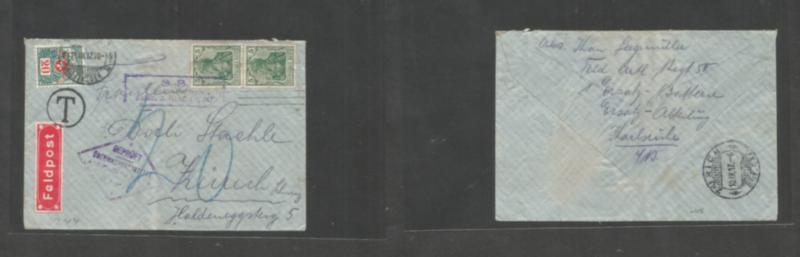 Military Mail. 1917 (Sept) Germany - France - Switzerland, Alsace - Switzerland, Zurich (11 Sept) Military mail Feldpost red tied label + Germania fkd at 10 pf rate, tied rolling cancellation + military cachet + taxed at arrival 20c p. due tied cds. Fine overseas scarce combination. (Image)