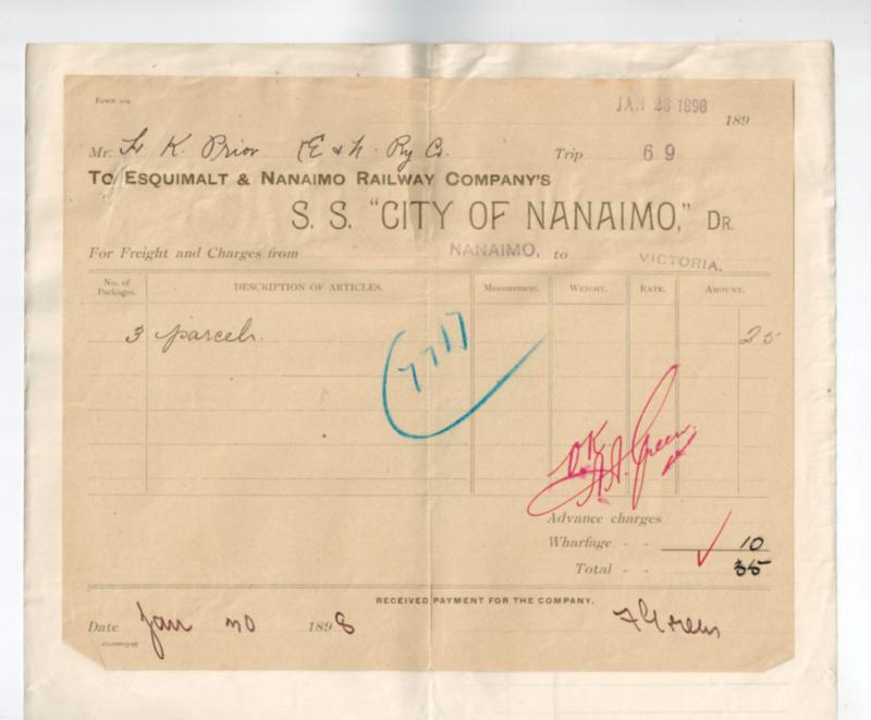 ESQUIMALT & NANAIMO RAILWAY RECEIPT "S.S. City of Nanaimo", dated 1898. PLUS 8 copies of other invoices, only one of which is shown in scans. (Image)