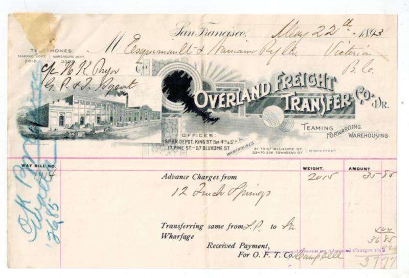 ESQUIMALT & NANAIMO RAILWAY CO 2 receipts dated 1893, one with elaborate letter head. (Image)