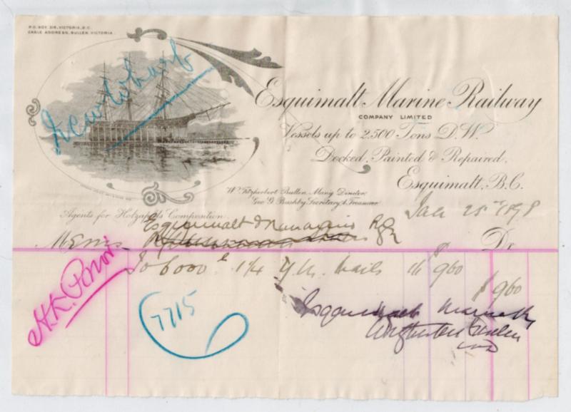 ESQUIMALT MARINE RAILWAY - INVOICE Written at Esquimalt BC, dated 1898. Has nice Sailing Ship image at Letterhead. (Image)