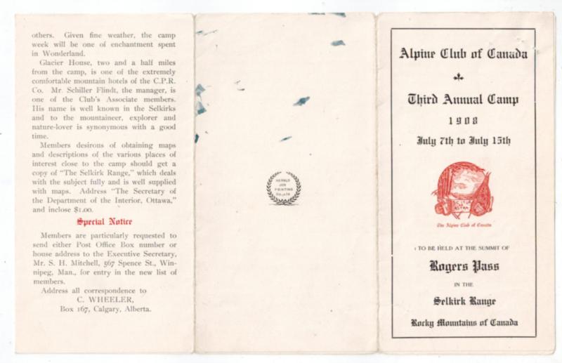 ALPINE CLUB OF CANADA Pamphlet dated 1908, 12 pages, only 3 from pages shown in scan. Camp to be held at Roger's Pass (Image)