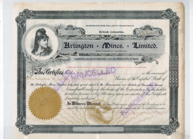 ARLINGTON MINES STOCK CERTIFICATE Located at Slocan BC. Nice design (Image)
