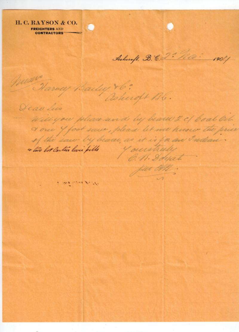 H. C. RAYSON & CO Freighters and Contractors, written at Ashcroft BC, dated 1904 (Image)