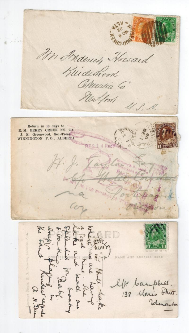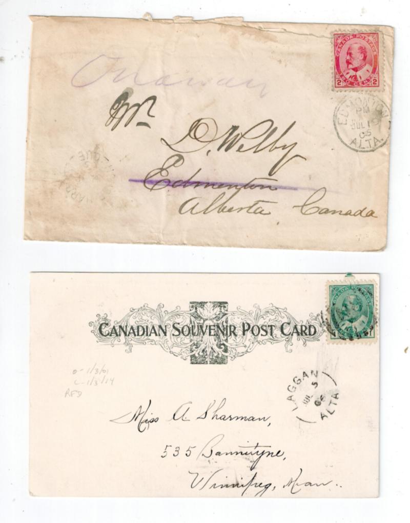 2 EARLY ALBERTA COVERS Edmonton dated Jul 19, 1905 and Laggan Alta dated 1906 on Postcard (Image)