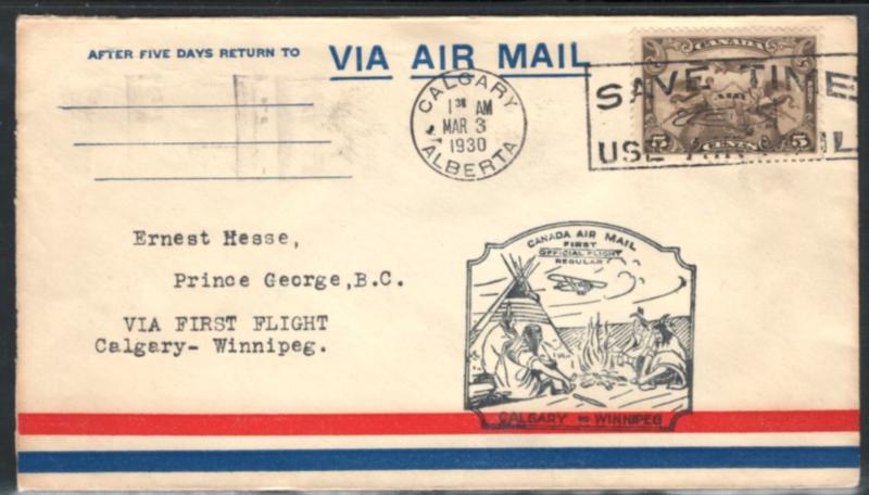 CALGARY TO WINNIPEG FIRST FLIGHT COVER Illustrated FFC dated March 3, 1930 for this inter-provincial Air Mail route. The cover has a Calgary CDS cancel and a "Use Air Mail" slogan cancel (Image)