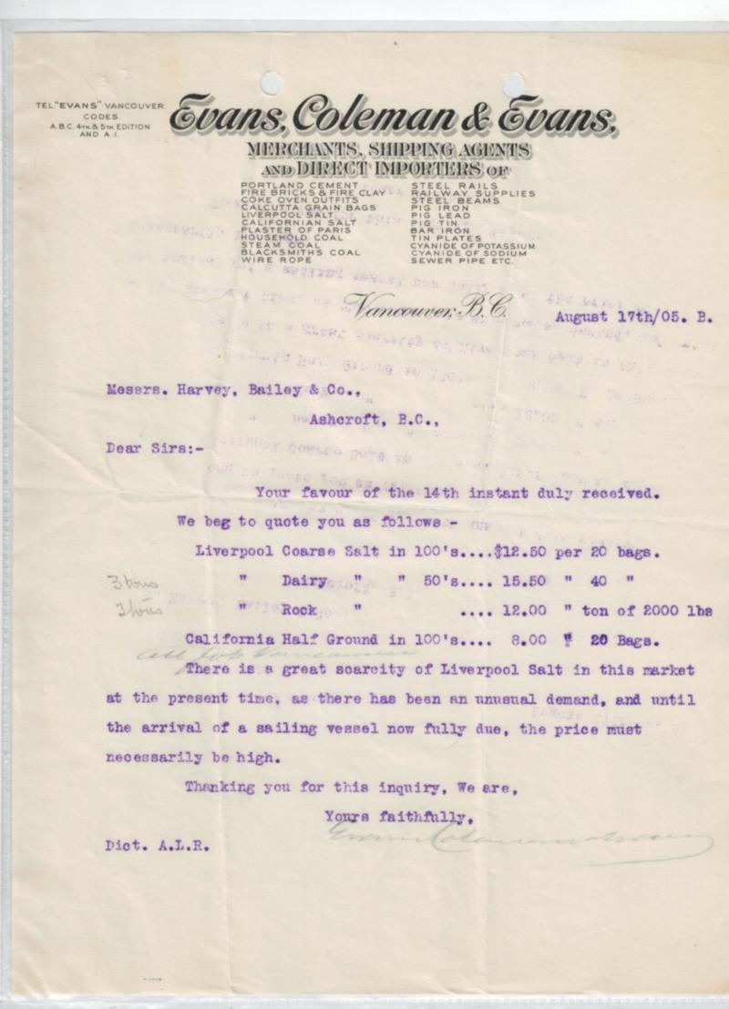EVANS, COLEMAN & EVANS LETTER Written at Ashcroft BC, dated 1905 (Image)