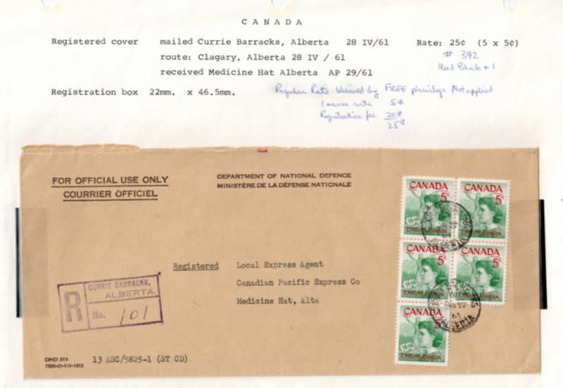 CURRIE BARRACKS A;LBERTA Registered letter, dated 1961 and franked with five 5 cent stamps. Mailed by the Department of National Defence. (Image)