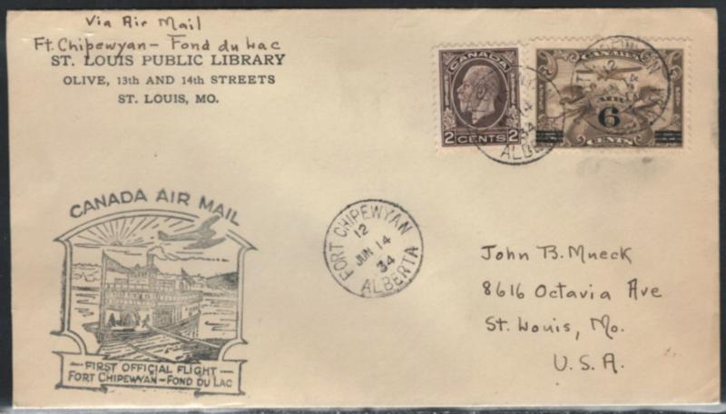 FORT CHIPEWYAN TO FOND DU LAC FIRST FLIGHT COVER Illustrated FFC dated June 14, 1934 for this inter-provincial Air Mail route. The cover has three Fort Chipewyan CDS cancels on the front and a Fond du Lac CDS cancel on the reverse (Image)