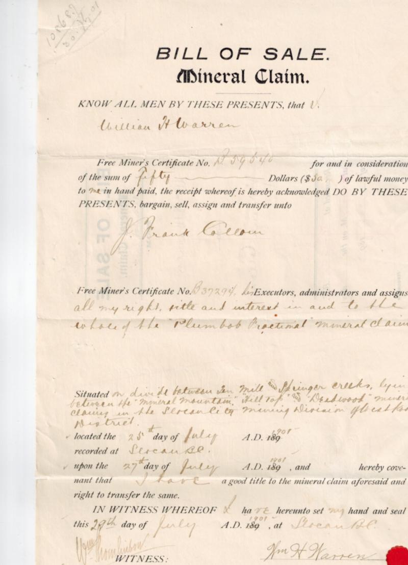 BILL OF SALE AND RECEIPT Sale of Mineral claim, Dated 1901 at Slocan BC (Image)