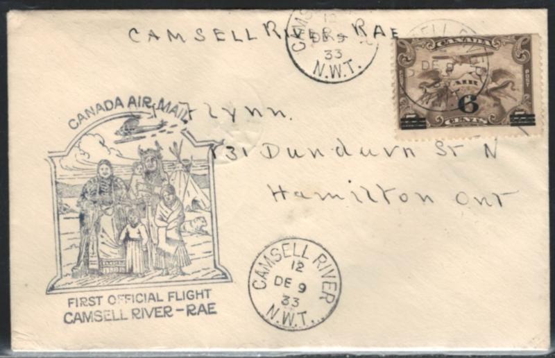 RAE TO CAMSELL RIVER FIRST FLIGHT COVER FFC dated Dec. 5, 1933 for this Air Mail route. The cover has 4 Rae CDS cancels on the front and a Camsell River CDS on the reverse along with a Dec. 16 Rec'd delay handstamp (Image)