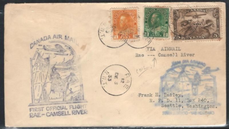 CAMSELL RIVER TO RAE FIRST FLIGHT COVER Illustrated FFC dated Dec. 9, 1933 for this Air mail route. The cover has three Camsell River CDS cancels on the front and Rae and Hamilton CDS cancels on the reverse (Image)