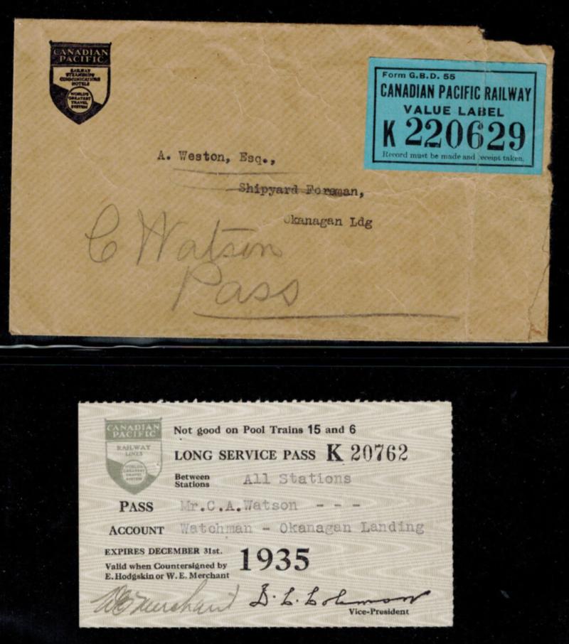 CANADIAN PACIFIC RAILWAY - VALUE LABEL COVER Value labels were CPR's internal mail registration system. Includes a Long Service Pass dated 1935 (very scarce) (Image)