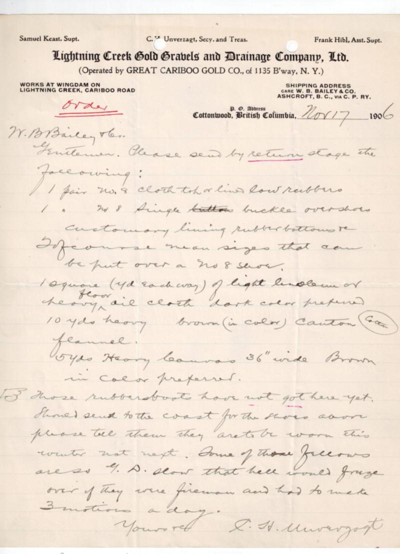 LIGHTENING CREEK GOLD, GRAVEL AND DRAINAGE COMPANY Letter written at Cottonwood BC, dated 1906 (Image)